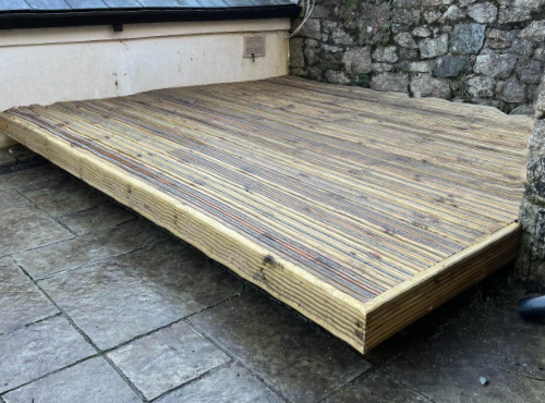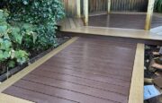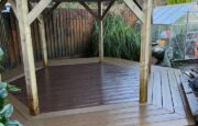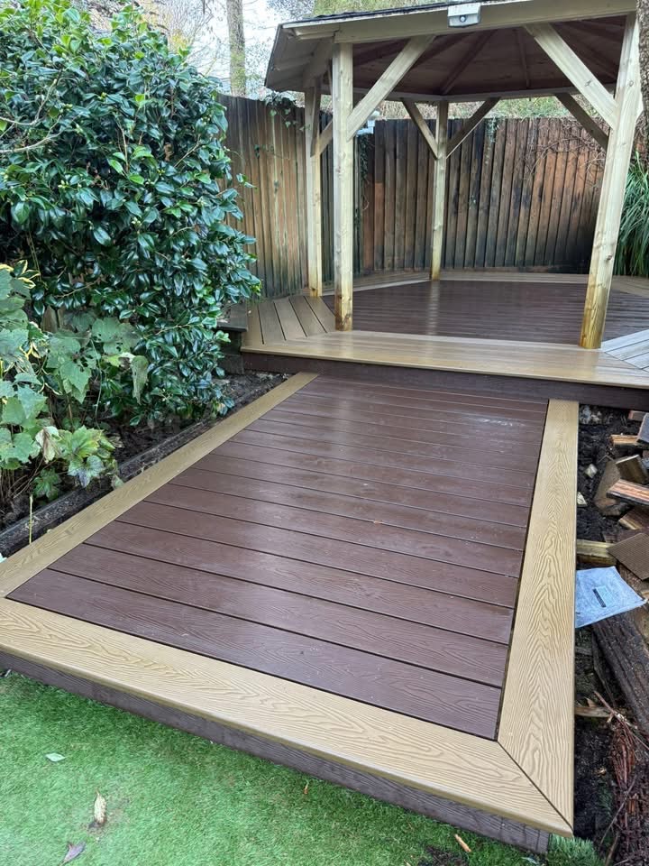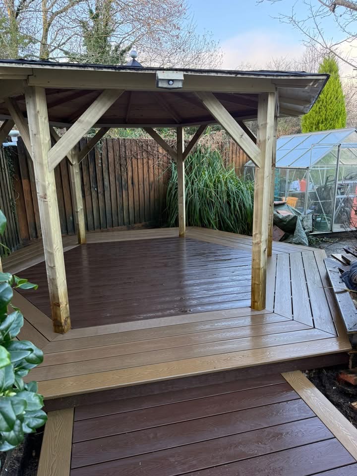 Curtis has done a fantastic job on converting our old Summerhouse and installing new composite decking all around it. Curtis re-designed the Summerhouse exactly to our specifications, (fussy and demanding clients lol – sorry Curtis) having to position posts at awkward angles to follow the Octagonal roof line and maintain and support the original roof without dismantling it. In addition, this was also a very complicated decking job involving having to cut and fit in alternate colours and rotate surfaces according to a pattern around the angled posts and two fences that ran at complicated angles.